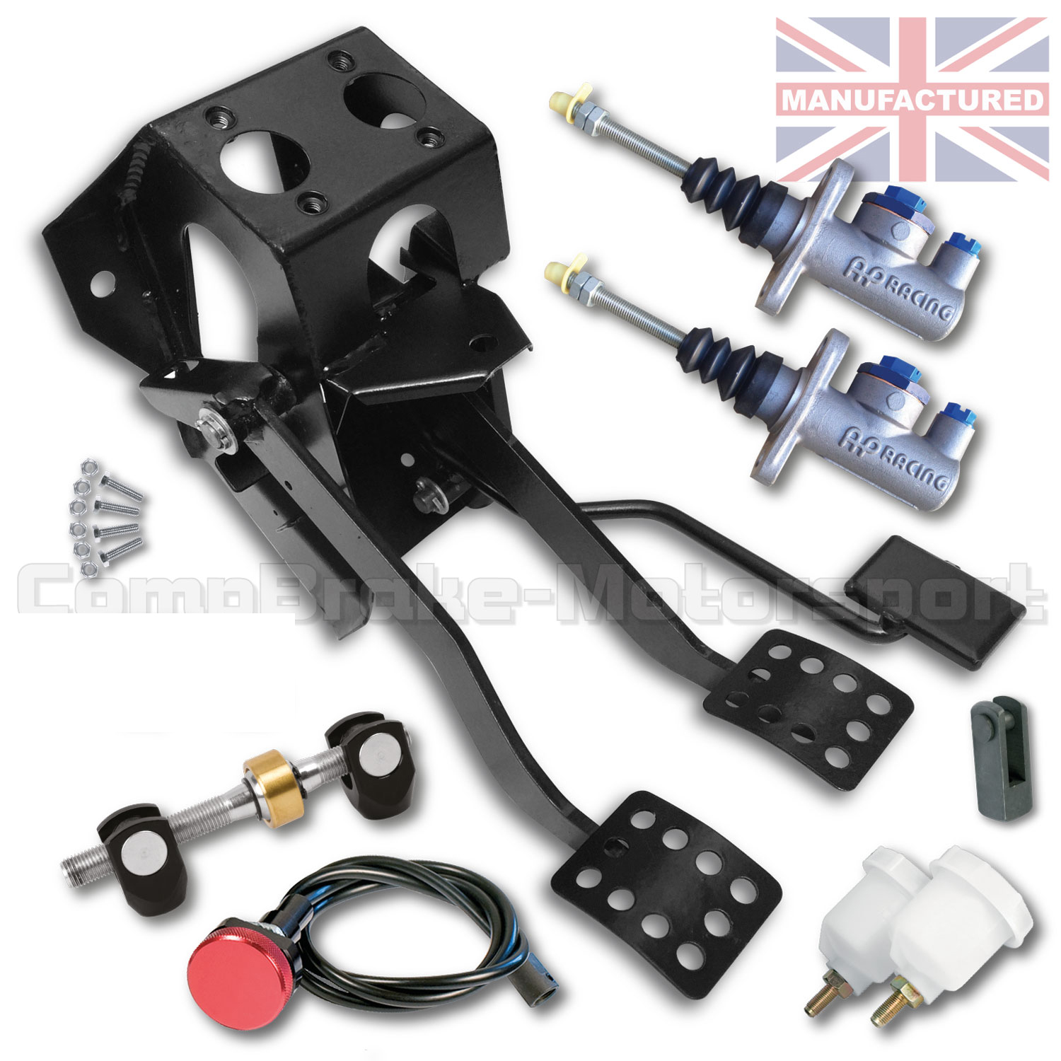 BOX KIT A INCLUDES – ESCORT BOX PLUS – [2 X AP MASTER CYLINDERS, CLEVIS, FIXINGS, BALANCE BAR, 2 X RESERVOIRS,& REMOTE CABLE ADJUSTER]